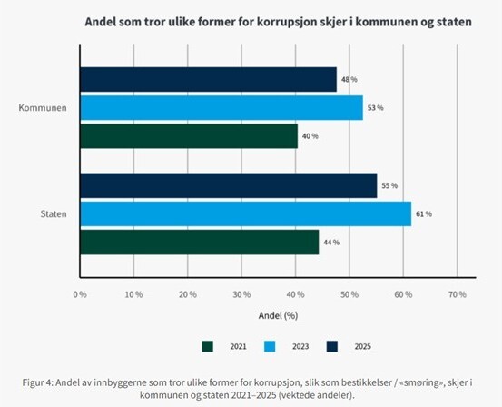 Når det gjelder korrupsjon i stort, svarer 55 prosent av innbyggerne at de tror det forekommer ulike former for korrupsjon i staten, mens 48 prosent tror det forekommer i kommunen sin. Det er en nedgang fra henholdsvis 61 prosent i staten og 56 prosent i kommunen i 2023.